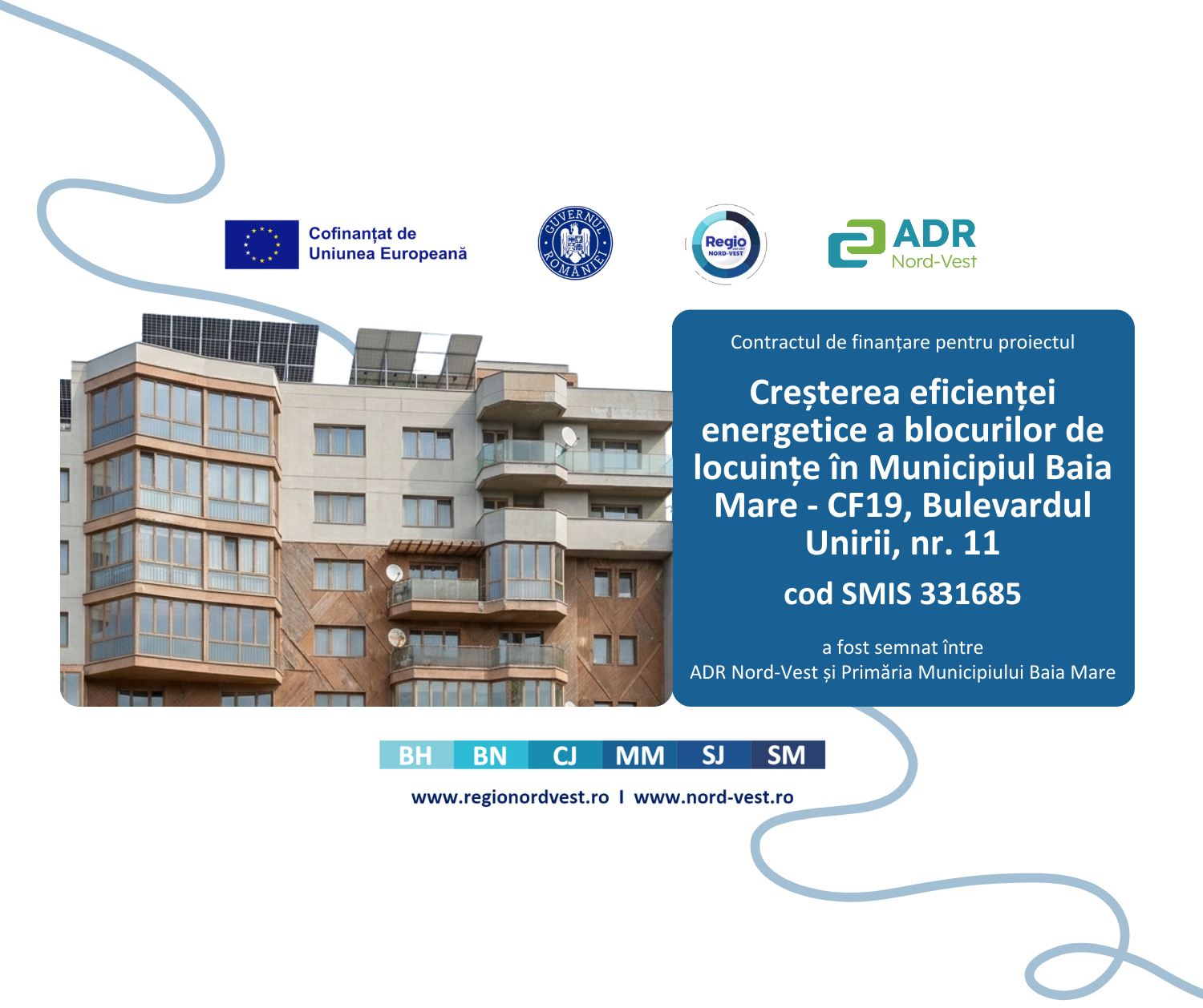 Proiectul „Creșterea eficienței energetice a blocurilor de locuințe în Municipiul Baia Mare – CF19, Bulevardul Unirii, nr. 11 – Cod SMIS 331685” este finanțat prin Prioritatea 3 „O regiune cu localități prietenoase cu mediul”, în cadrul Programului Regional Nord-Vest 2021–2027, și contribuie la Obiectivul de politică „O Europă mai verde”, cu sprijinul Fondului European de Dezvoltare Regională.