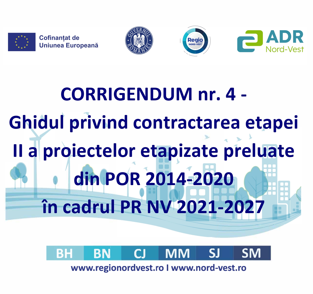 Autoritatea de Management pentru Programul Regional Nord-Vest 2021-2027 (REGIO Nord-Vest) emite CORRIGENDUM nr.4 pentru Ghidul Solicitantului privind contractarea etapei II a proiectelor etapizate preluate din Programul Operațional Regional 2014-2020 în cadrul Programului Regional Nord-Vest 2021-2027, documentele consolidate cu anexele aferente și sinteza modificărilor sunt disponibile la adresa de mai jos: