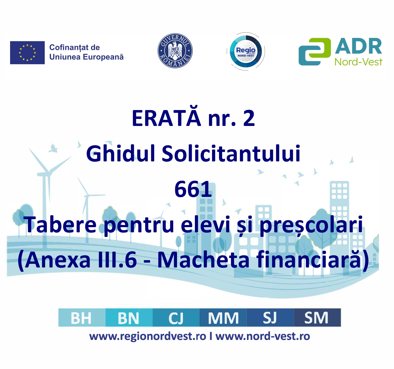 ERATĂ pentru Ghidul Solicitantului 661 – Tabere pentru elevi și preșcolari și anexelor aferente apelului de proiecte PRNV/2025/661 /1 – din cadrul Programului Regional Nord-Vest 2021-2027.
