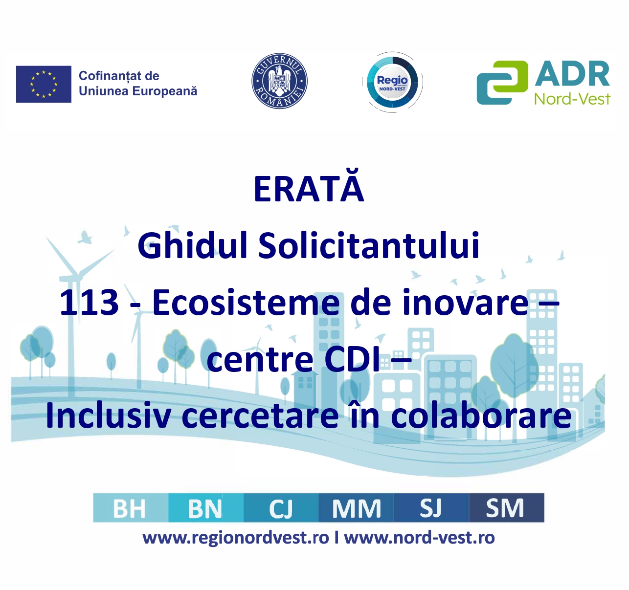 ERATĂ pentru Ghidul Solicitantului 113 – Ecosisteme de inovare – centre CDI – Inclusiv cercetare în colaborare și anexelor aferente apelului de proiecte PRNV/2025/113/1 – din cadrul Programului Regional Nord-Vest 2021-2027.