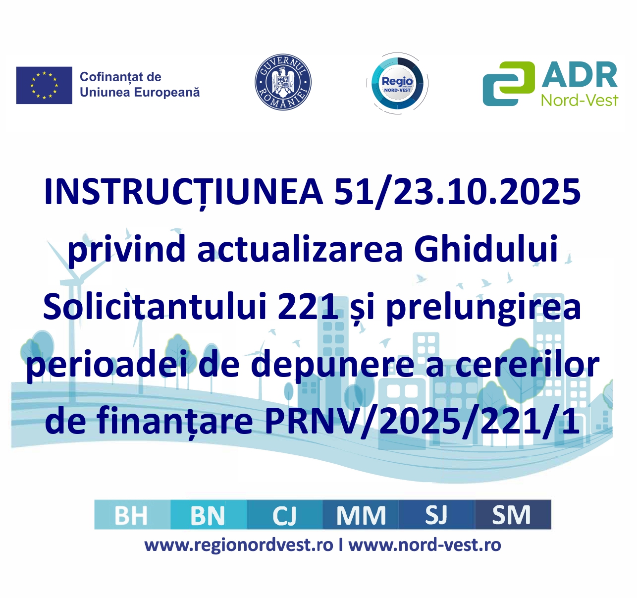 Art.1 – În Ghidul Solicitantului „221 – Înființarea și operaționalizarea Centrului Regional de Date Nord-Vest” (publicat în data de 18.07.2025), se modifică capitolul 4.3. Perioada de depunere a proiectelor / 4.3.2.Data și ora închiderii apelului de proiecte, noua dată fiind 31.12.2025, ora 10:00.